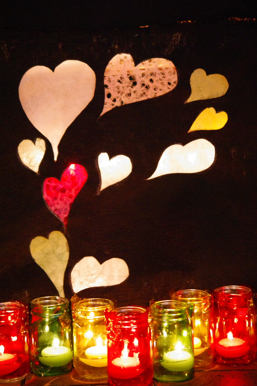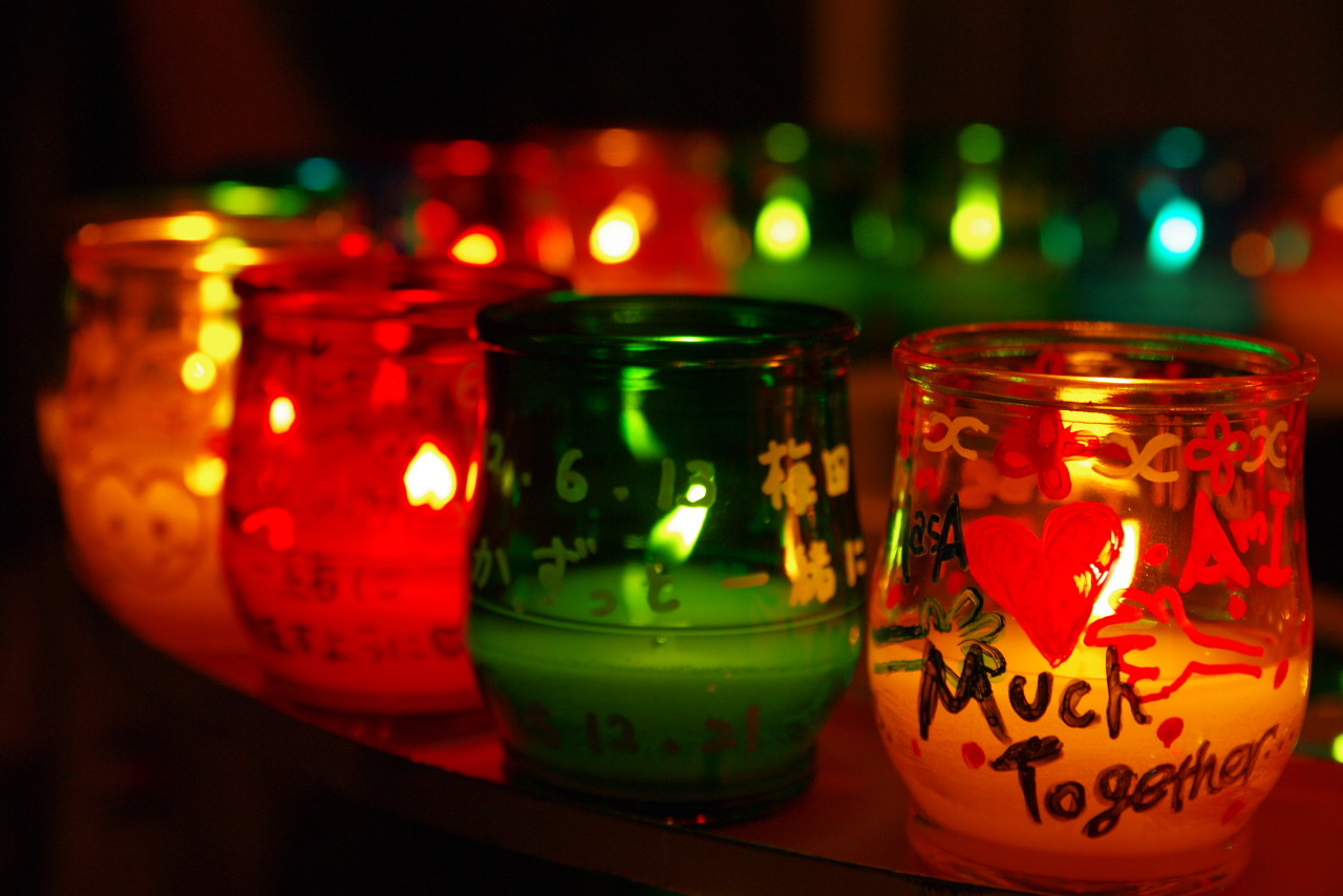 キャンドルのビンに、みなさんがそれぞれの想いを書いています。