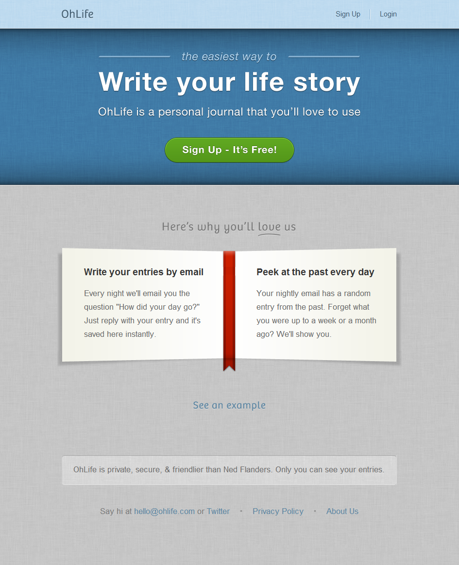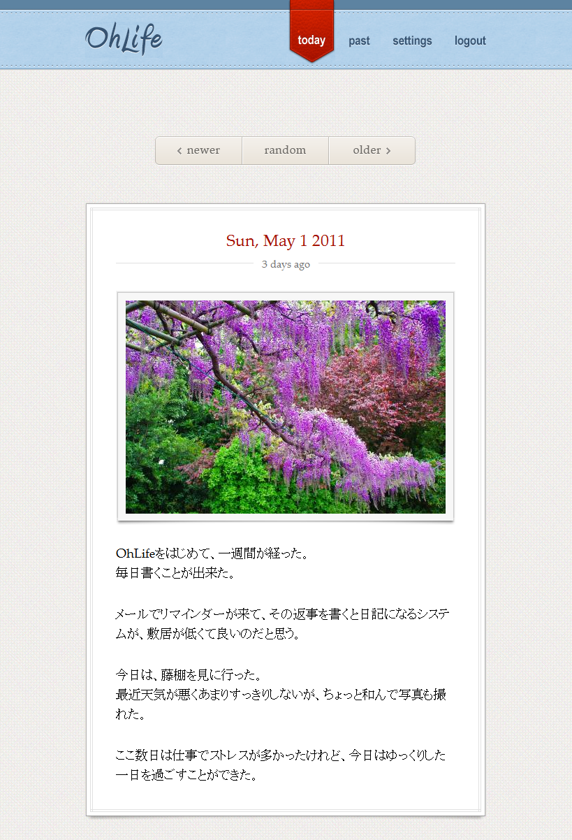 (Tech Crunchの紹介記事「非公開の日記をつけるサービスOhLife: 忘れずに続けられるための工夫がおもしろい 」)